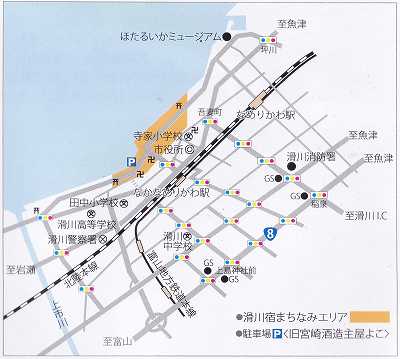 滑川宿街道街の地図 Pが旧宮崎酒造の位置(「ぼんぼこさ」)
